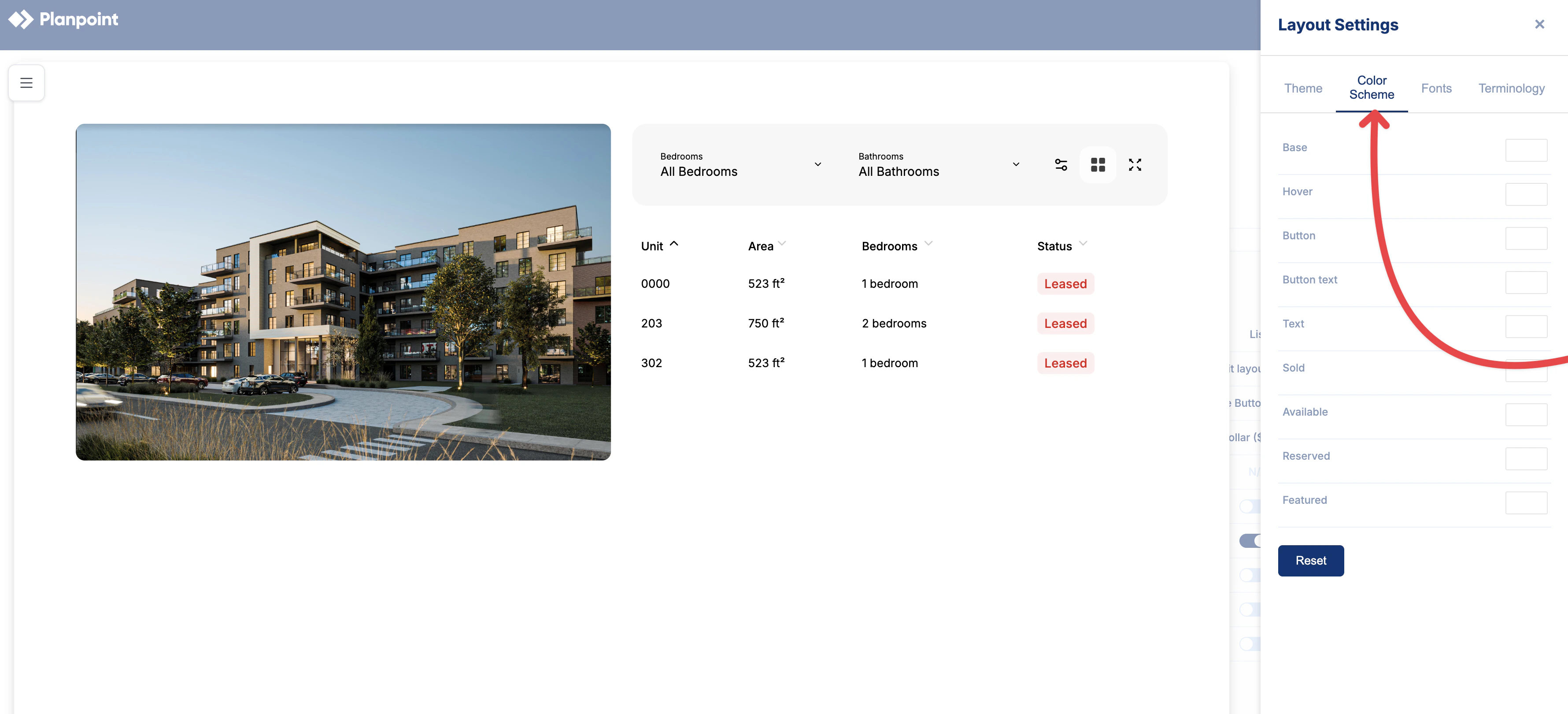The Color module allows you to customize the color palette of the plan viewer so it better reflects your brand and visual preferences. You can define colors for key interface elements, including the background of the viewer, hover interactions where floors and plans are highlighted, buttons and button text, general text, and unit status indicators such as available, reserved, sold, and featured. These colors are applied consistently across the project, including interactive areas when users engage with the exterior building image. All changes are applied immediately, allowing you to preview and fine-tune your styling in real time. Colors can be set using any HEX or RGB value, providing full flexibility and precision. If you want to edit your color scheme, simply follow the instructions below:Documentation Index