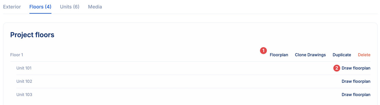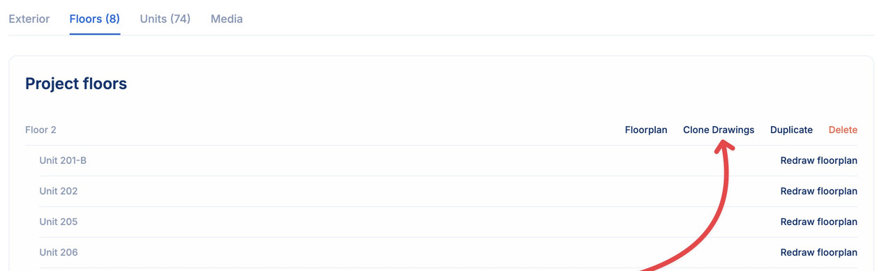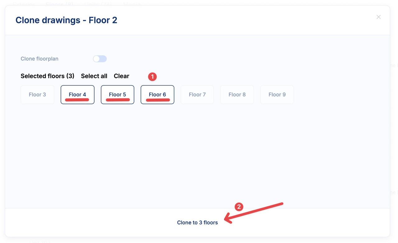 After choosing the floor you wish to copy from, it will serve as the reference floor, and its drawings will be cloned. You may choose as many floors as needed. Enabling the Clone Floorplan option will copy both the drawings and the floor plans from the selected floor.